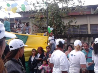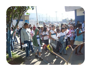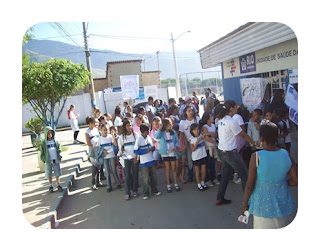 | Alunos da Escola Maria Quitéria participaram da caminhada, junto com a Diretora Mariana, crianças do grupo de Reforço escolar sendo as ACS responsáveis pelo grupo: Janaina, Joyce e Roberta. |