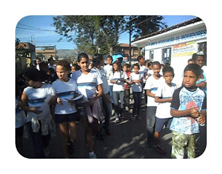 | Alunos da Escola Maria Quitéria participaram da caminhada, junto com a Diretora Mariana, crianças do grupo de Reforço escolar sendo as ACS responsáveis pelo grupo: Janaina, Joyce e Roberta. |